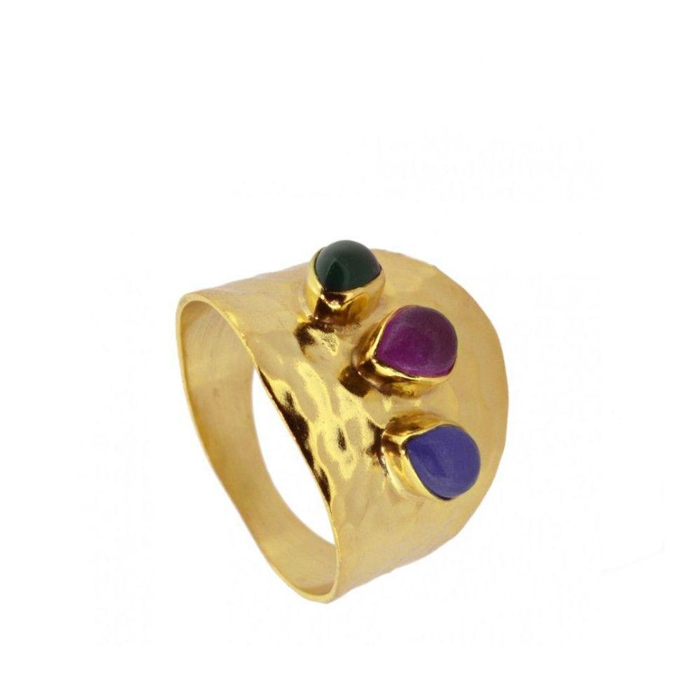 Anillo de plata de ley de 925 con baño de oro de 18 k. Con 3 piedras, jade verde, azul y morado